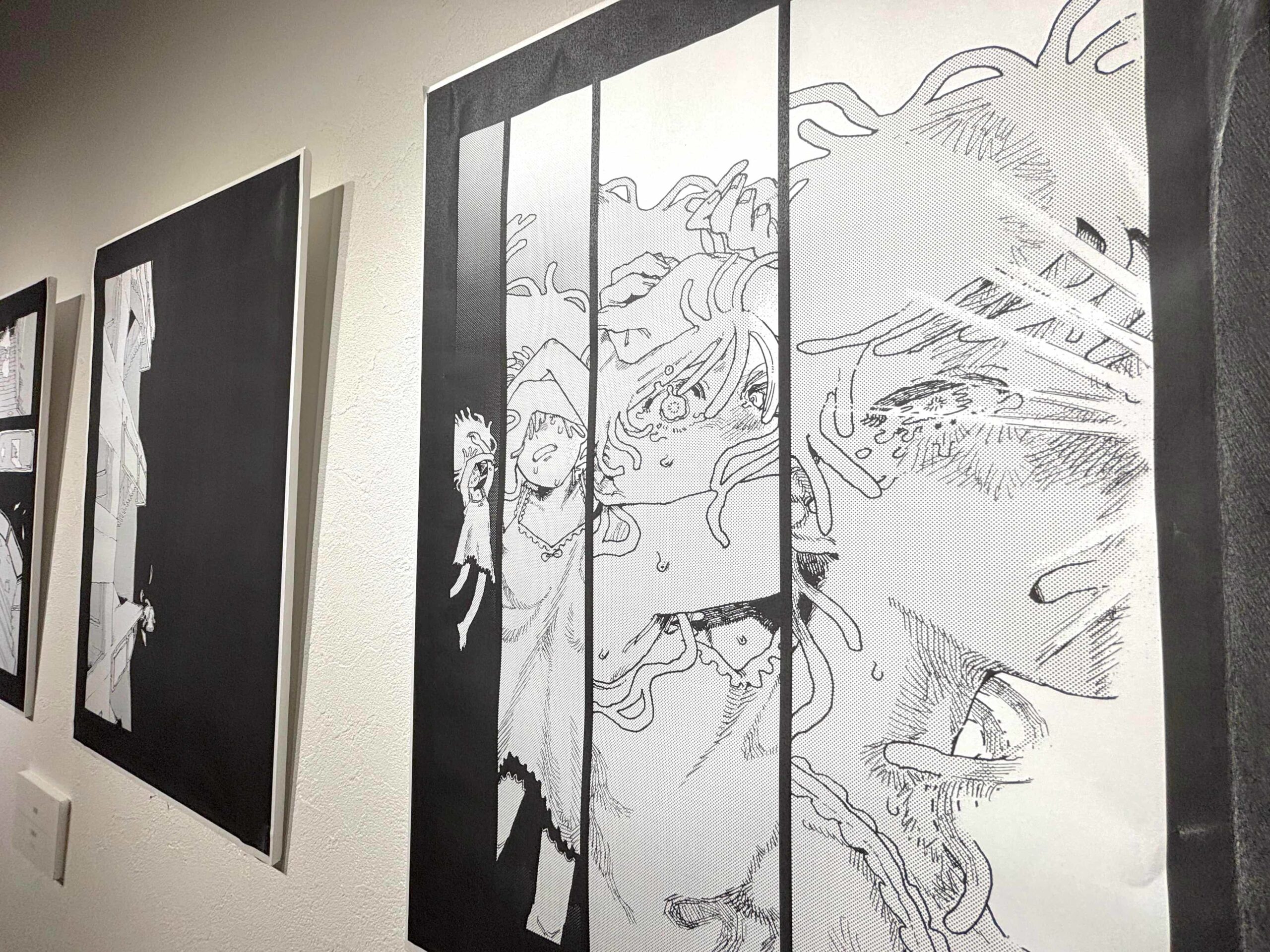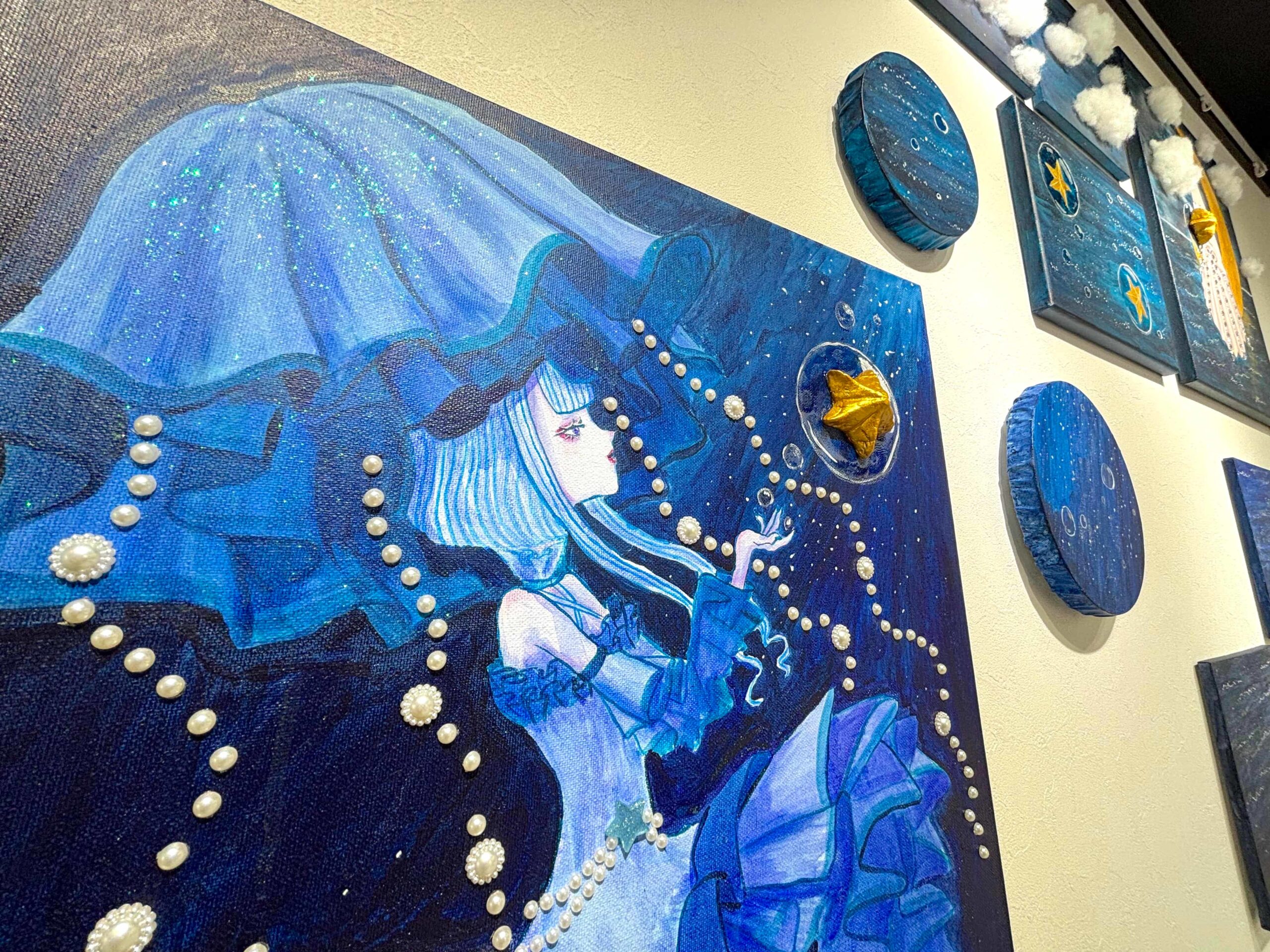 1階には、漫画的構成を用いながら感情の奔流を鋭く切り取ったモノクロームのデジタル作品と、月夜と深海とが対をなすように構成された、青を基調とする幻想的な絵画が並ぶ。
