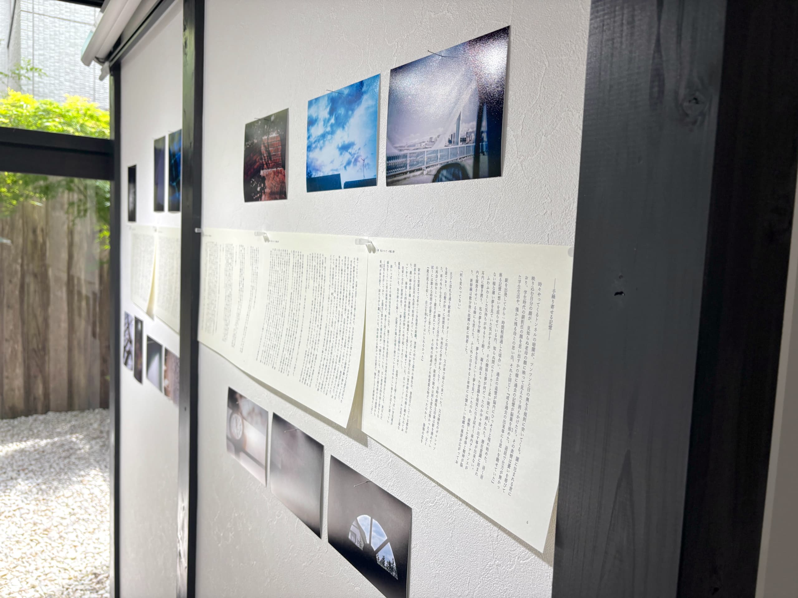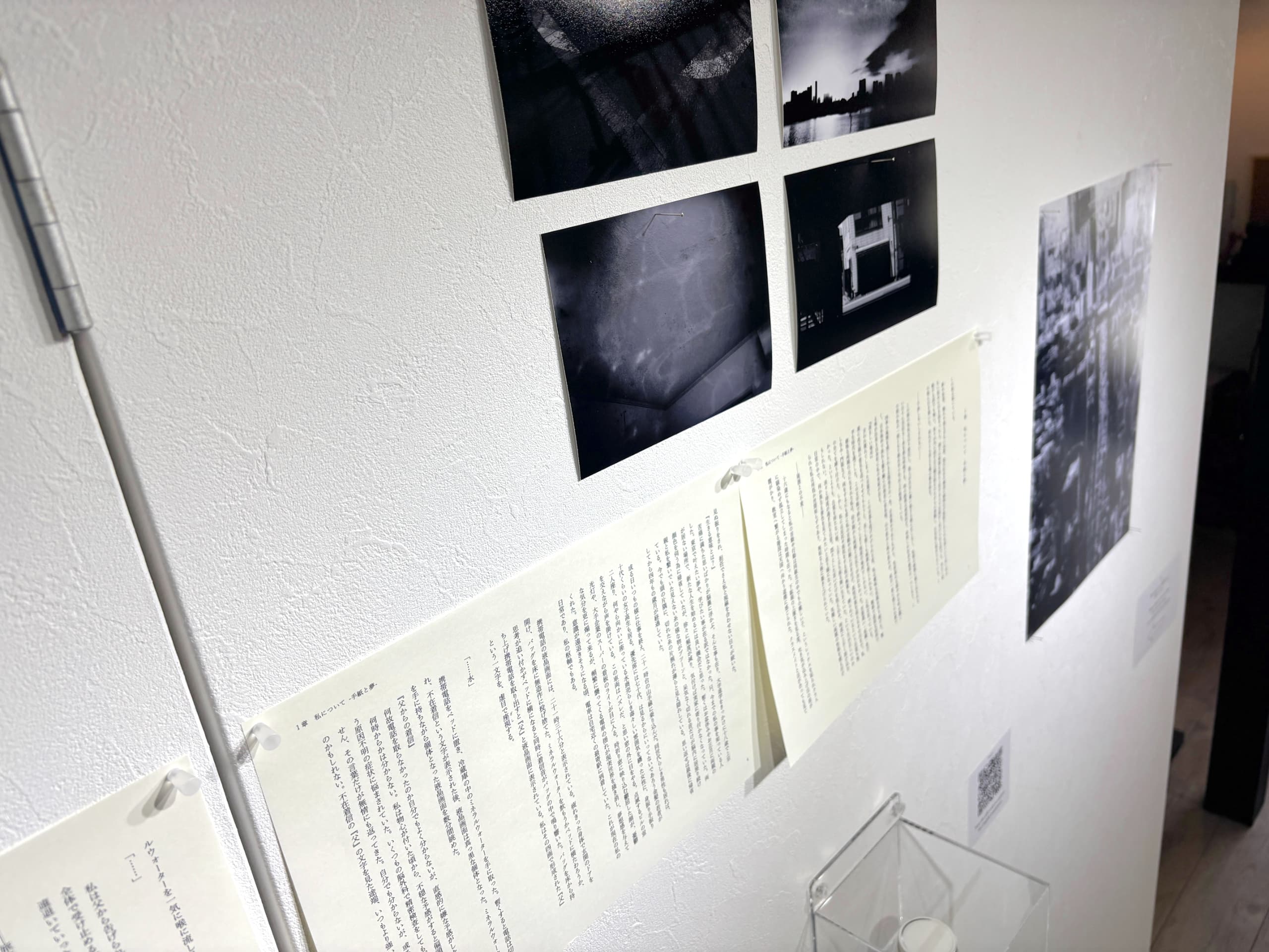 壁面には、長巻のように連なるテキストと、それに応答するように配置された大小様々な写真が躍動している。